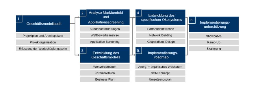 Aufbauend auf der Marktanalyse erfolgt eine iterative Entwicklung des Geschäftsmodells. Darüber hinaus werden relevante Partner zur Entwicklung des spezifischen Ökosystems für das neue Geschäftsmodell identifiziert und für das Projekt gewonnen. Hierbei können Kunden von dem weiten Netzwerk von TCW profitieren. Bei der Umsetzung begleitet Sie TCW gerne im Anschluss an die Erstellung der Roadmap, in der die offenen Schritte und Meilensteine definiert werden.