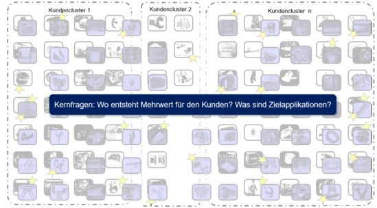Den zentralen Schritt aus TCW Sicht stellt die Analyse des Marktumfelds und das Applikationsscreening dar. Hierbei wird der Nutzen der Innovation aus Kundensicht analysiert und in einer Applikationslandkarte zusammengefasst. Zu den Kernfragen zählen: