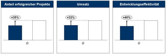 Die Potenziale durch systematisches Innovationsroadmapping spiegeln sich vor allem in der Erhöhung des Anteils erfolgreicher F&E-Projekte durch klare Zielorientierung und Priorisierung wider. Mittel- bis langfristig lässt sich die erfolgreiche Strategiefindung und stringente Projektplanung in der Regel an hohen Umsatzsteigerungen ablesen. Kurzfristig macht sich der Einsatz einer guten Innovationsroadmap in der Entwicklungseffektivität bemerkbar. Durch die intensive Planung der F&E-Projekte und Ressourcen mit einer klaren Zielvorstellung gelingt es, in hohem Maß unnötige Verschwendung zu vermeiden.