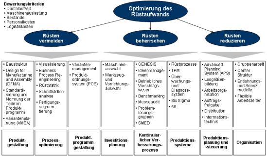 Aufgrund der steigenden Anforderungen an die Durchlaufzeit für die Produktherstellung müssen Produkte immer schneller auf den Markt gebracht werden. Nur in den seltensten Fällen akzeptiert der Kunde eine Wartezeit. Dabei müssen Unternehmen eine immer höhere Variantenvielfalt, die mit einer Verkürzung der Produktlebenszyklen einhergeht, beherrschen. Die Fertigungsprozesse sind dabei geprägt durch den Einsatz bestandsoptimaler, logistischer Prinzipien und die Anwendung neuer Prozesstechnologien, um die Prozesseffizienz zu steigern. Die Folge daraus sind sinkende Losgrößen, eine erhöhte Anzahl an Sortenwechseln, eine reduzierte Anlagenproduktivität und höhere Rüstkosten. Da die Tätigkeiten des Rüstprozesses zumeist mit einer nicht wertschöpfenden Stillstandszeit der Fertigungsanlagen verbunden sind, erlangen die Konzepte für die Rüstzeitreduzierung eine besondere Bedeutung. Dies erfordert ein ganzheitliches Rüstmanagement, das die rüstoptimale Ausgestaltung des Arbeitssystems für den Sortenwechsel umfasst.
