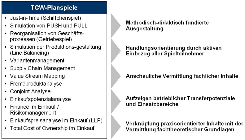 Die vom TCW angebotenen Planspiele erfüllen die Anforderungen an ein zeitgemäßes Bildungs- und Kompetenzmanagement. Sie zeichnen sich durch eine methodisch-didaktisch fundierte Gestaltung, Handlungsorientierung durch aktiven Einbezug aller Spielteilnehmer, eine anschauliche Vermittlung fachlicher Inhalte sowie das Aufzeigen betrieblicher Transferpotenziale und Einsatzbereiche aus. Die Planspiele ermöglichen die Verknüpfung praxisorientierter Inhalte mit der Vermittlung fachtheoretischer Grundlagen. Wirkungen unterschiedlicher betriebswirtschaftlicher Konzepte werden durch die Integration von Fallbeispielen und Best-Practice-Analysen in die Planspiel-Sequenzen sowie durch die Erhebung und den Vergleich von Kennzahlen je Spielrunde vermittelt.