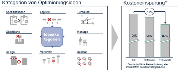 Zusammenfassend konnte auf Basis des strukturierten Vorgehens zur Ideengenerierung in Form der Lieferantenintegration eine große Anzahl an potenzialträchtigen Initiativen gestartet werden. Für jegliche Komponenten des Generatorgehäuses konnten durch die Lieferantenintegration die Einkaufspreise innerhalb eines Zeitraumes von sechs Monaten bereits um vier Prozent und innerhalb eines Jahres um bis zu 13 Prozent reduziert werden.