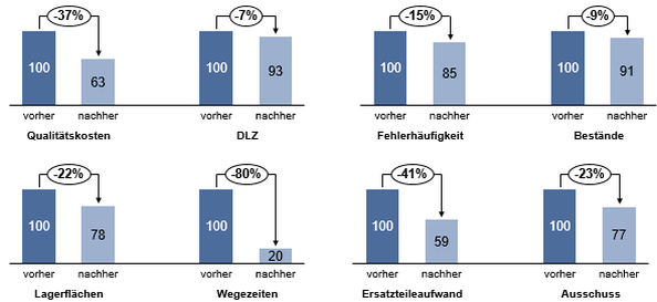 Die Effekte manifestieren sich vor allem in geringeren Supply Chain- und Produktionskosten. Die Automatisierung in der Produktion spart Personalkosten ein, die höhere Transparenz über die Wertströme reduziert Verschwendung in Form von nicht abgestimmten Kapazitäten und Beständen. Durch die enge Systemanbindung der Lieferanten können Wiederbeschaffungszeiten reduziert und die Versorgungssicherheit verbessert werden. Ein weiterer wichtiger Nutzenvorteil beim Einsatz von IoT ist die frühzeitige Detektion von Anomalien beispielsweise in der Lagerwirtschaft, um die benötigten Bestandsmengen hinsichtlich Reichweite und Kosten zu optimieren.