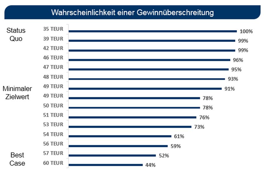 Im gemeinsamen Workshop werden zusammen mit den Mitarbeitern die risikounbelasteten Eingangskennzahlen mit den Risiko- und Maßnahmenauswirkungen beaufschlagt. Mit diesen beaufschlagten Eingangskennzahlen wird über eine Monte-Carlo-Simulation die Verteilung der Zielkennzahl - im aktuellen Fall der EBIT - erzeugt.