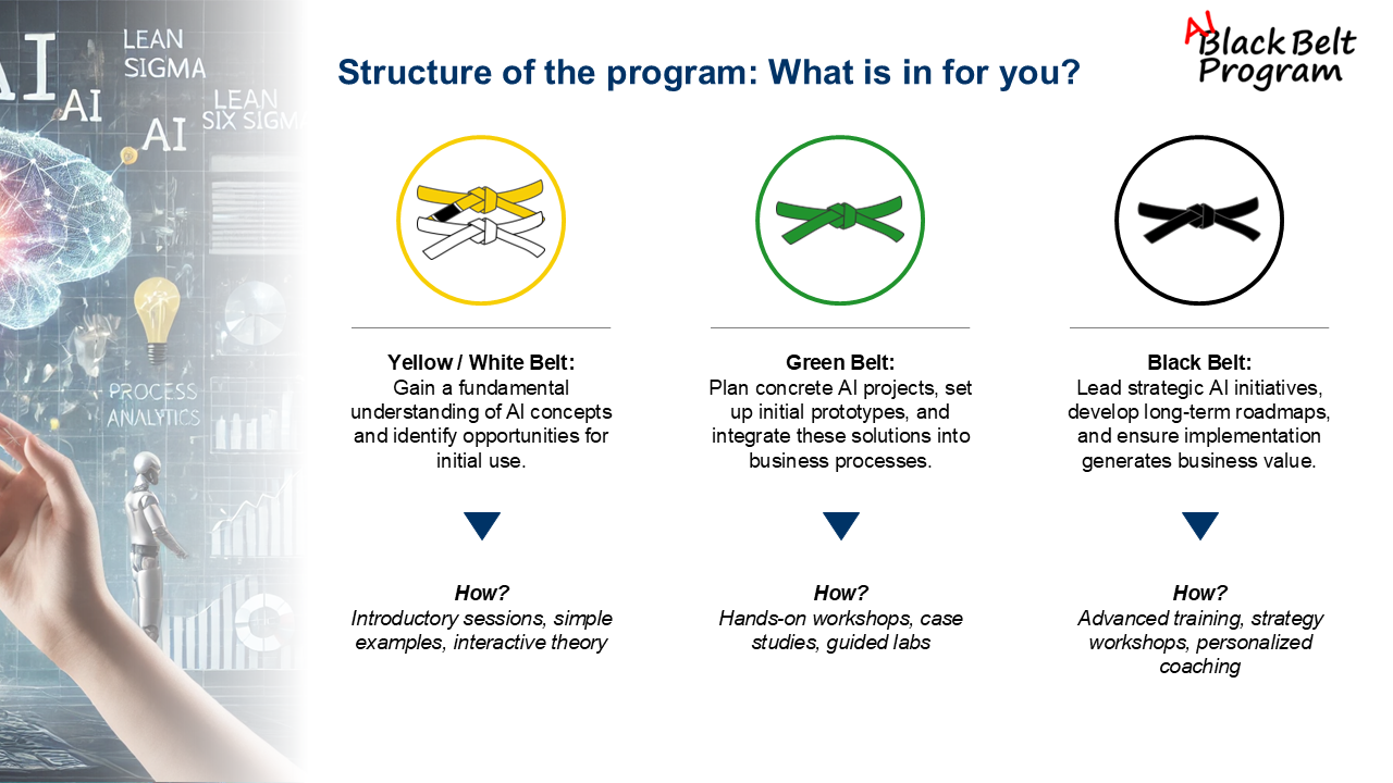 The AI-Blackbelt program is a structured, practice-oriented training developed from many years of hands-on experience in identifying, evaluating, and implementing AI use cases across industries. The program bridges the gap between academic AI knowledge and real-world business application.