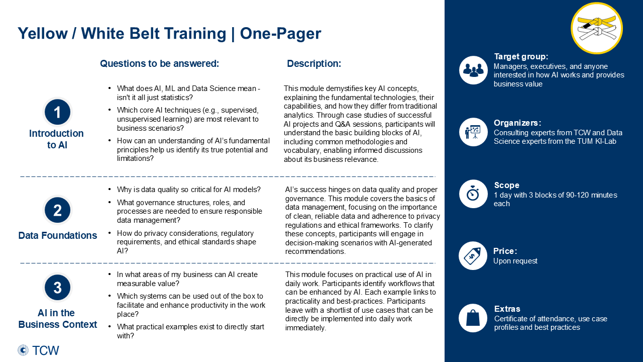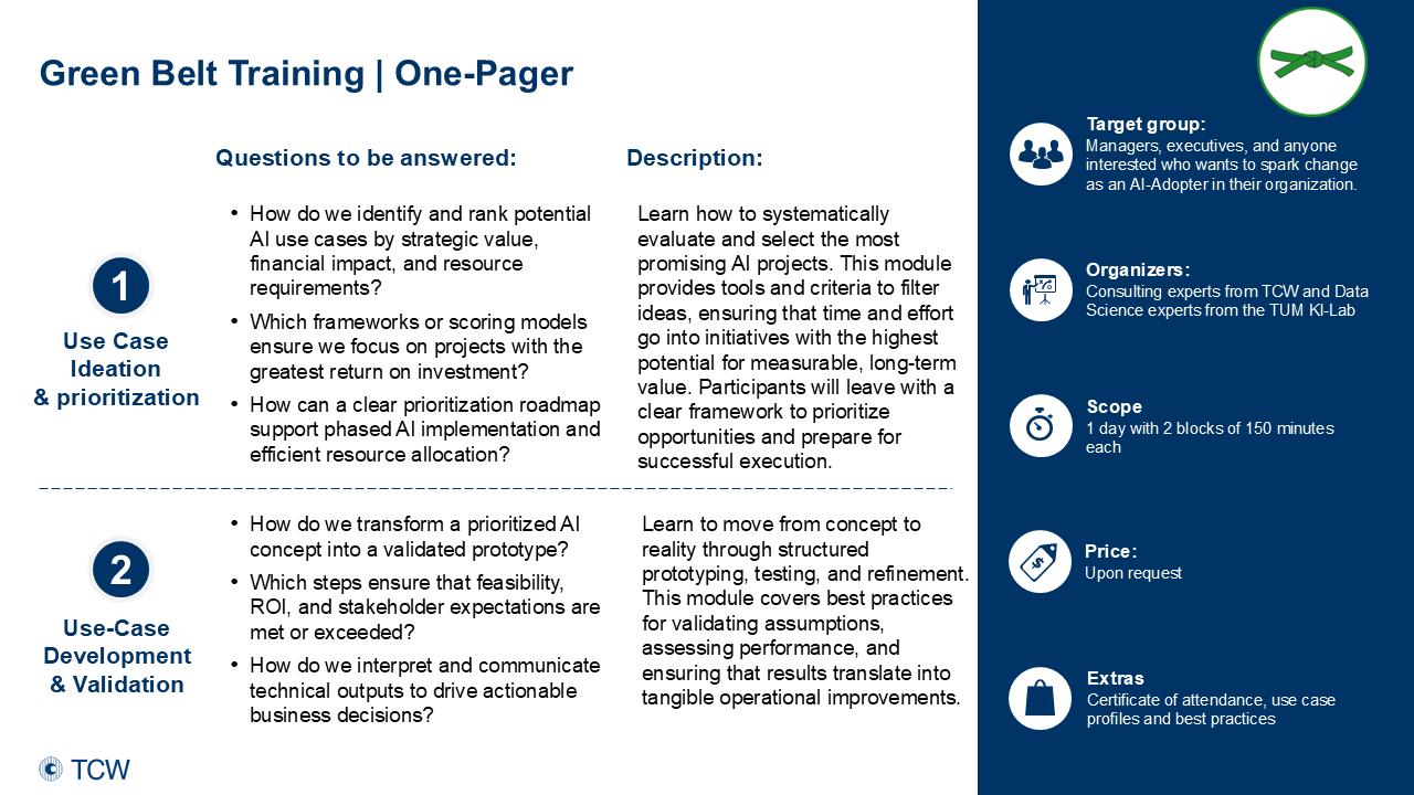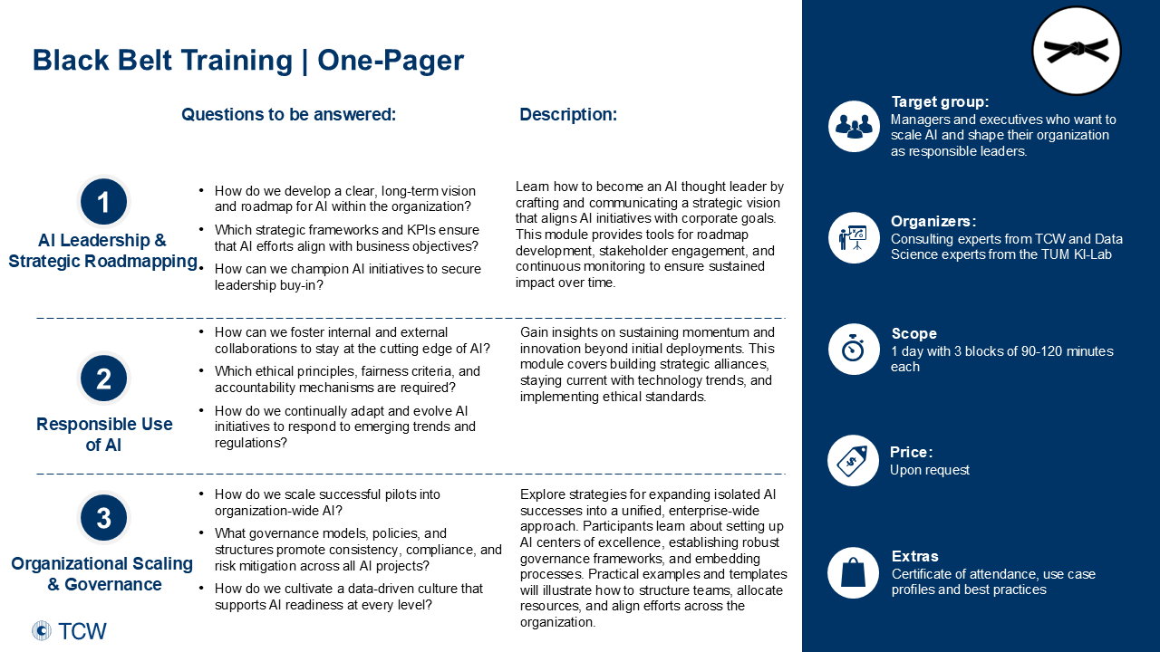 Contact us to receive detailed program information and discuss how the AI-Blackbelt training can be tailored to your organization: Blackbelt@tcw.de