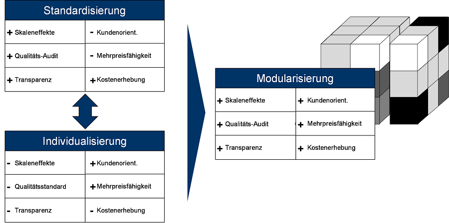 Die Idee dabei ist, vormontierte Module an das Hauptmontageband anzuliefern, die anschließend über standardisierte technische Schnittstellen zu einem Gesamtsystem zusammengefügt werden. Die resultierende Verringerung der Variantenkomplexität in den Hauptmontagetakten führt zu stabileren und beruhigteren Montageprozessen. Insbesondere leistet die Modularisierung einen Beitrag dafür, Zukunftsoptionen zuzulassen statt zu behindern. Hierzu zählen unter anderem die Modulvergabe an Zulieferer, die Ermöglichung von Lieferantenparks zur Kombination von Modulfertigung und Logistikcenter außerhalb der eigentlichen Werksflächen und somit grundsätzlich die Erhöhung der Wandlungsfähigkeit der Produktionssysteme. Insgesamt stärkt dies die Freiheitsgrade für das gesamte zukünftige Setup des Produktionssystems und leistet somit einen wesentlichen Beitrag zur Zukunftsfähigkeit der Automobilproduktion.