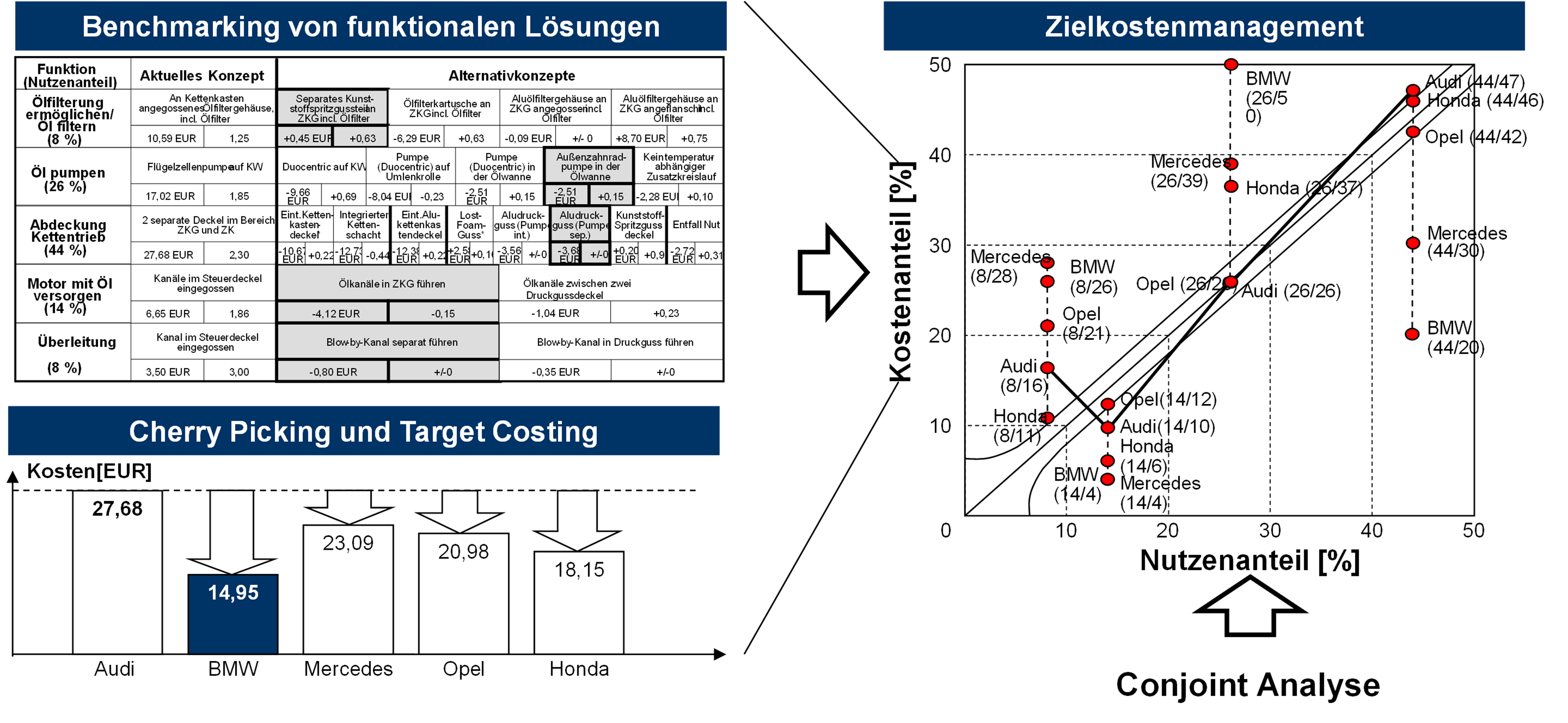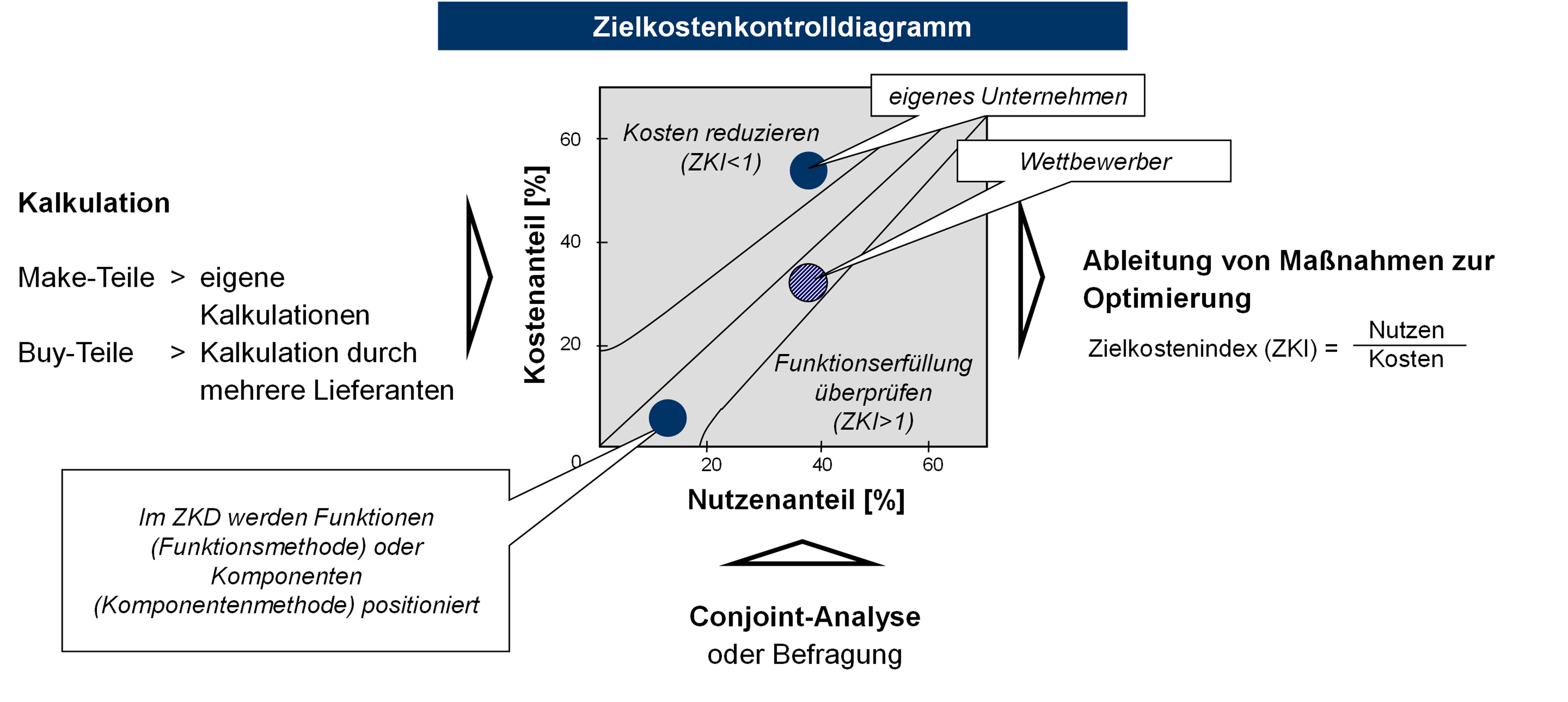 Die Entwicklung eines solchen Modells beginnt mit einer umfassenden Analyse der bestehenden Ausgangssituation in Bezug auf die vorherrschende Ist-Kostenstruktur des Unternehmens. Hierbei werden sowohl direkte als auch indirekte Kosten detailliert erfasst, um ein vollständiges Bild der aktuellen Kostensituation zu erhalten. Anschließend werden die identifizierten Kosten weiter unterteilt, um eine strukturierte Kostenbetrachtung zu ermöglichen. Ist die transparente Aufschlüsselung der Ist-Kosten gelungen, kann der Blick auf die Bestimmung der Sollkosten gelegt werden. Hierbei kommen nun innovative Methoden zum Einsatz. Ein Benchmarking mit Wettbewerbsprodukten sowie alternativen Fertigungsmethoden gibt wertvolle Hinweise auf mögliche Einsparungspotenziale. Basierend auf Marktanforderungen, Kundenbefragungen, Wettbewerbsanalysen und internen Effizienzpotenzialen lassen sich schließlich realistische Zielkosten für einzelne Produktbereiche definieren. Um zukünftige Entwicklungen besser berücksichtigen zu können, werden zudem mathematische Modelle erstellt, die verschiedene Einflussgrößen auf die Kosten abbilden und eine dynamische Betrachtung zu ermöglichen. Die Aufgabe besteht nun darin, die identifizierten Leistungslücken zu schließen, um die angestrebte Soll-Kostenstruktur des Produktprogramms zu erreichen.